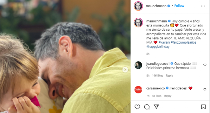 Hoy cumple 4 años esta muñequita. Qué afortunado me siento de ser tu papá! Verte crecer y acompañarte en tu caminar por esta vida me llena de amor. TE AMO PEQUEÑA MÍA #kailani #felizcumpleaños” escribió Mauricio en su publicación que fue comentada tanto por medios de comunicación como por algunos de sus compañeros actores.