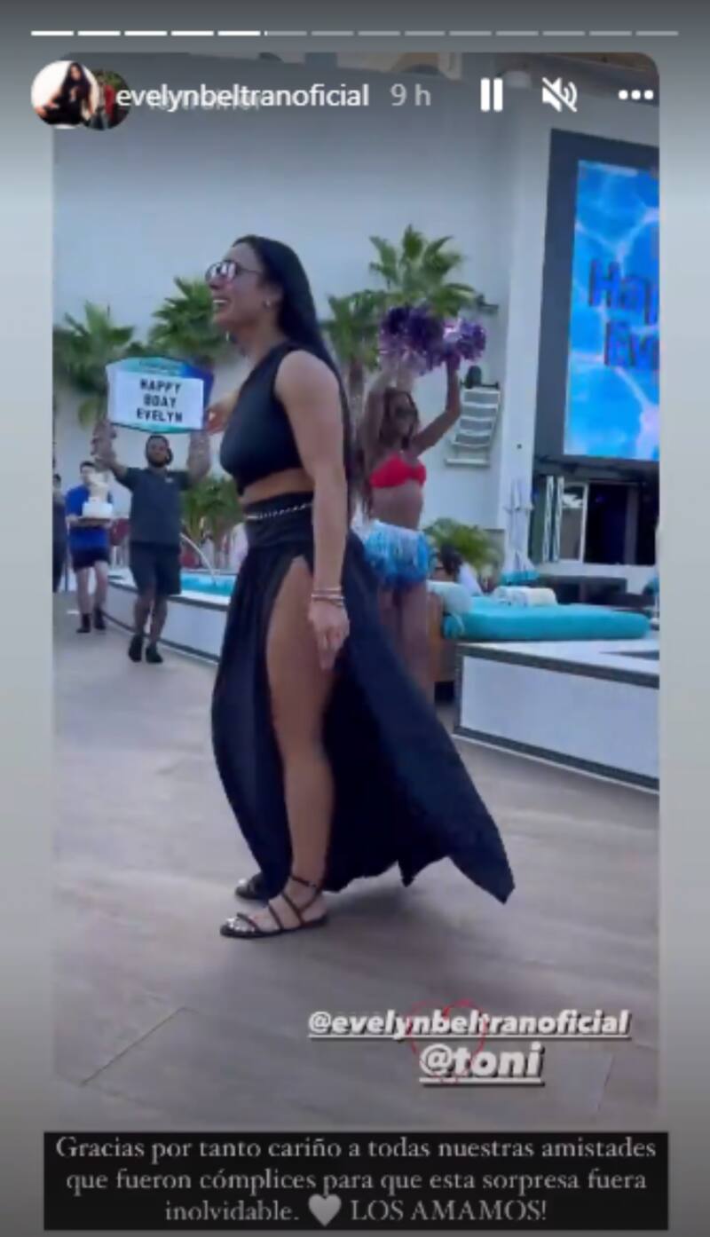 En el fin del trayecto, le esperaba una fiesta en la piscina en el que, sobre una enorme pantalla, se podía leer: "Happy birthday, Evelyn Beltrán!". Evelyn de inmediato agradeció a todos los presentes, sobre todo, a Toni.