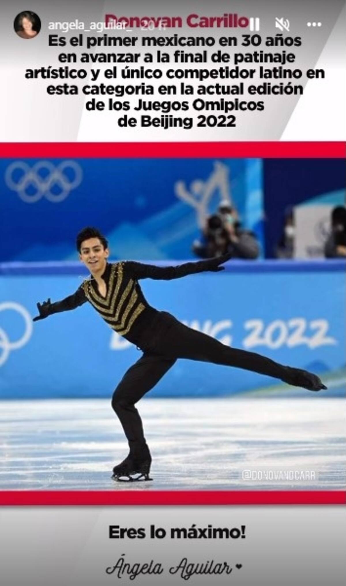 "Es el primer mexicano en 30 años en avanzar a la final de patinaje artístico y el único competidor latino en esta categoría en la actual edición de los juegos Olímpicos de Beijing 2022", posteó Ángela, en un innegable tono de homenaje.