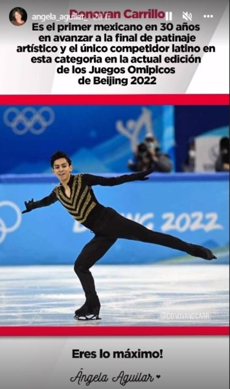 La cantante nacida en Los Ángeles, EE.UU., pero que se siente una mexicana más, elogió el extraordinario hito que registró el patinador y subió a su storie de Instagram una foto del deportista en acción, con una leyenda que demuestra el grafo de emoción que le produjo a Ángela.