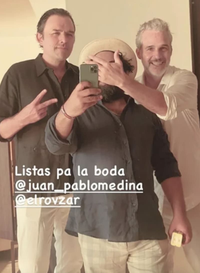 El actor de La casa de las Flores, también se fotografió por separado con Mauricio Borroso, mejor conocido como El Diablito, junto al novio de Bárbara Mori, los tres están frente a un espejo, haciendo poses divertidas antes de dar inicio a la ceremonia. Los tres famosos presumieron de su look más elegante para la playa.