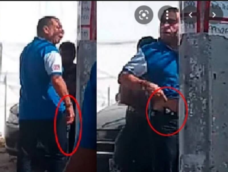 En las imágenes se observa cómo el señor Octavio Pérez dirige su mano a la cintura al mismo tiempo que se muestra alterado y gritando a la persona con quien tiene el altercado, pero no es hasta que se da la vuelta cuando se alcanza a ver que porta una pistola con la cual amenaza al sujeto en cuestión.