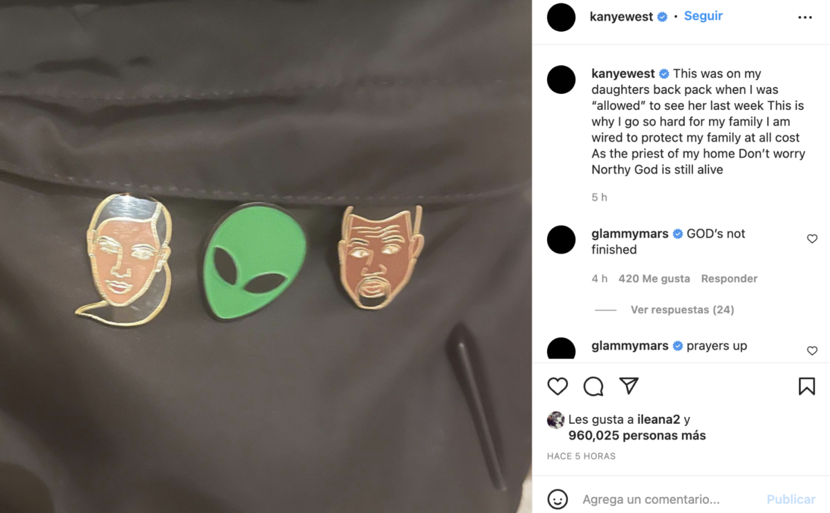 "Esto estaba en la mochila de mi hija cuando 'me permitieron' verla la semana pasada. Esta es la razón por la que soy tan duro con mi familia. Como el sacerdote de mi hogar voy a proteger a mi familia a toda costa. No se preocupen, el Dios de Northy sigue vivo", escribió Kanye en el post, mostrando unos pines que tiene North pegados a su mochila, los mismo reflejan la cara del rapero, la de Kim y una cara de un alienígena.