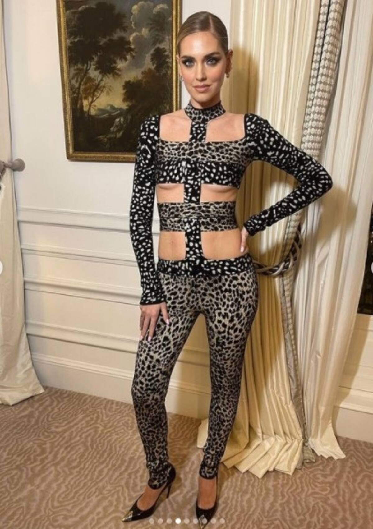 Uno de sus más destacados looks fue un mono con estampado aleopardado que le proporcionó Roberto Cavalli. De mangas largas, cuello halter y pantalones ceñidos, más unos zapatos de tacos negros y complementos dorados, Chiara dejó a sus "competidoras" con la vara muy alta en la Semana de la Moda parisina.