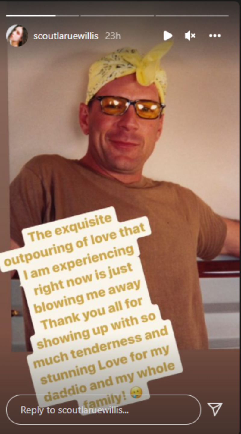 Pero también el público llenó las redes sociales con infinidad de muestras de solidaridad para el histrión y su familia, razón por la cual, Scout Willis, hija de Bruce, se tomó el tiempo para publicar en sus historias de Instagram un mensaje de agradecimiento para todos los que han manifestado su cariño por el también productor.