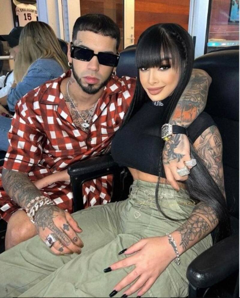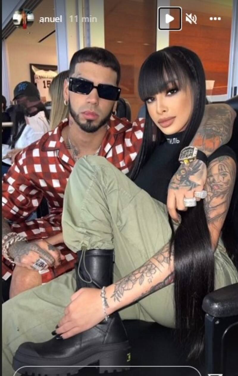 Muy abrazados y en una pose romántica, vistiendo de manera informal, Anuel y Yailin reaparecieron en uno de los palcos del estadio LoanDepot Park luciendo para una fotografía en la que Anuel aparece con un traje corto cuadriculado y lentes de sol, y ella con una blusa oscura y un pantalón acinturado, con el pelo oscuro, liso y una coqueta chasquilla.