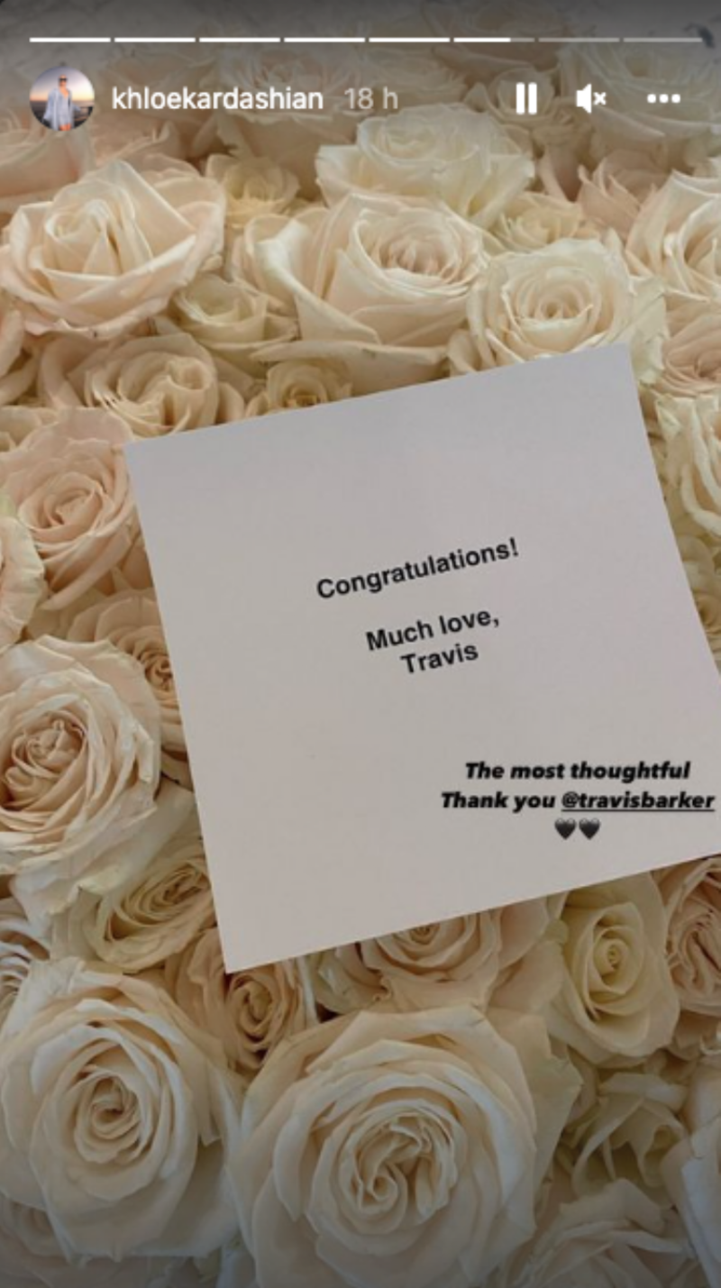 Fue la propia Khloé quien publicó en sus redes sociales una foto del regalo y la nota que acompañaba el arreglo floral: "¡Felicitaciones! Mucho amor, Travis".