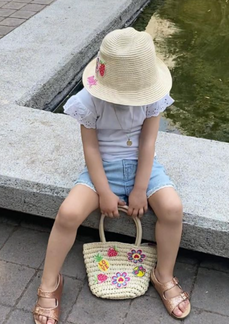 A un lado de lo que parece ser un lago, luce un short de mezclilla corto con una blusa blanca y sandalias doradas que hacen juego con su cadena en el mismo tono y el sombrero que complementa su encantador atuendo.