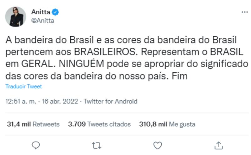 Por otra parte, a través de su cuenta oficial de Twitter, la cantante explicó a sus seguidores el uso de los colores de su bandera. “La bandera de Brasil y sus colores pertenecen a los brasileños. Representan al Brasil en general. Nadie puede apropiarse del significado de los colores de la bandera de nuestro país", enfatizó.