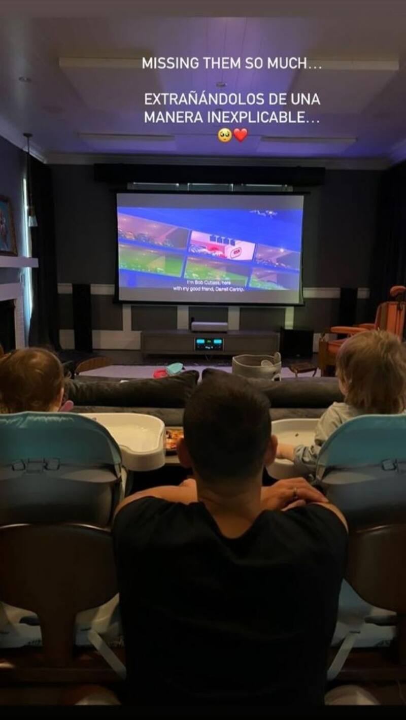 Mediante su cuenta de Instagram escribió cuánto los extrañaba. “Los extraño mucho. Extrañándolos de una manera inexplicable”, escribió en una historia en la que subió una foto donde aparece Noah y Nala sentados en sus respectivas sillas de niño, su padre en medio de ellos, todos dan la espalda y se puede observar que están viendo algo relacionado al futbol.