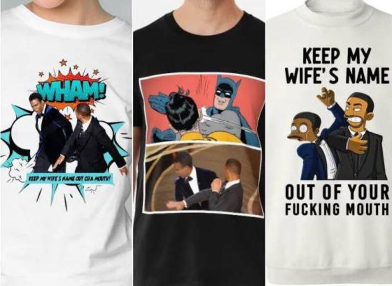 Asimismo, parte de estos diseños incluyen la fecha en la que se produjo el evento, así como también, la leyenda: "día para la historia". Algunos otros, han exteriorizado en la imagen las palabras que mencionó el intérprete de King Richard luego de la bofetada a Chris: "Saca el nombre de mi mujer de tu p**ta boca".