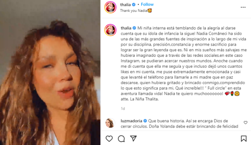 “Querida Thalía, Gracias por este hermoso mensaje... felicidades por tu increíble carrera... abrazos a ti y a tu familia.. no puedo esperar para conocerte”, le escribió Nadia a Thalía a través de su cuenta de Instagram.