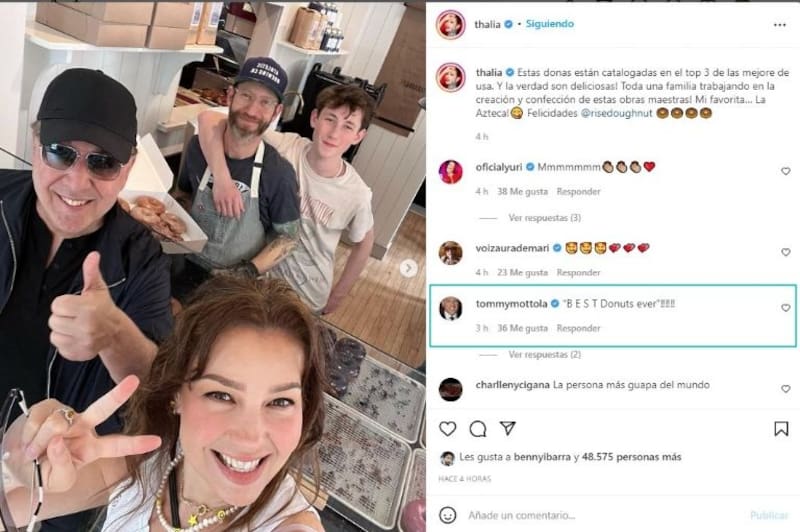 La protagonista de telenovelas como Marimar y María Mercedes quiso compartir la culpa, así que se le ve al lado de su esposo, el productor musical, Tommy Mottola, quien lejos de negarse, hasta puso una reseña: “Las mejores donas por siempre”.