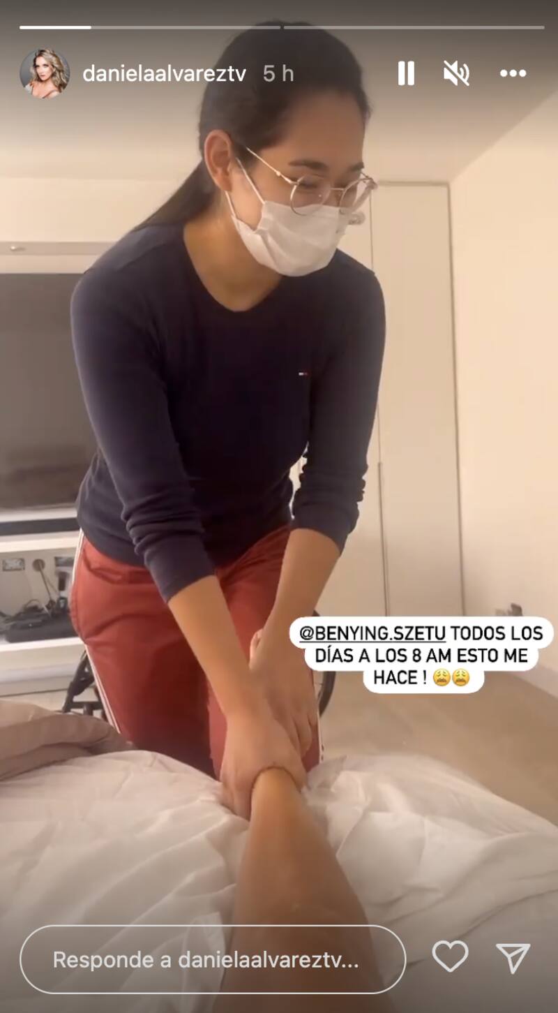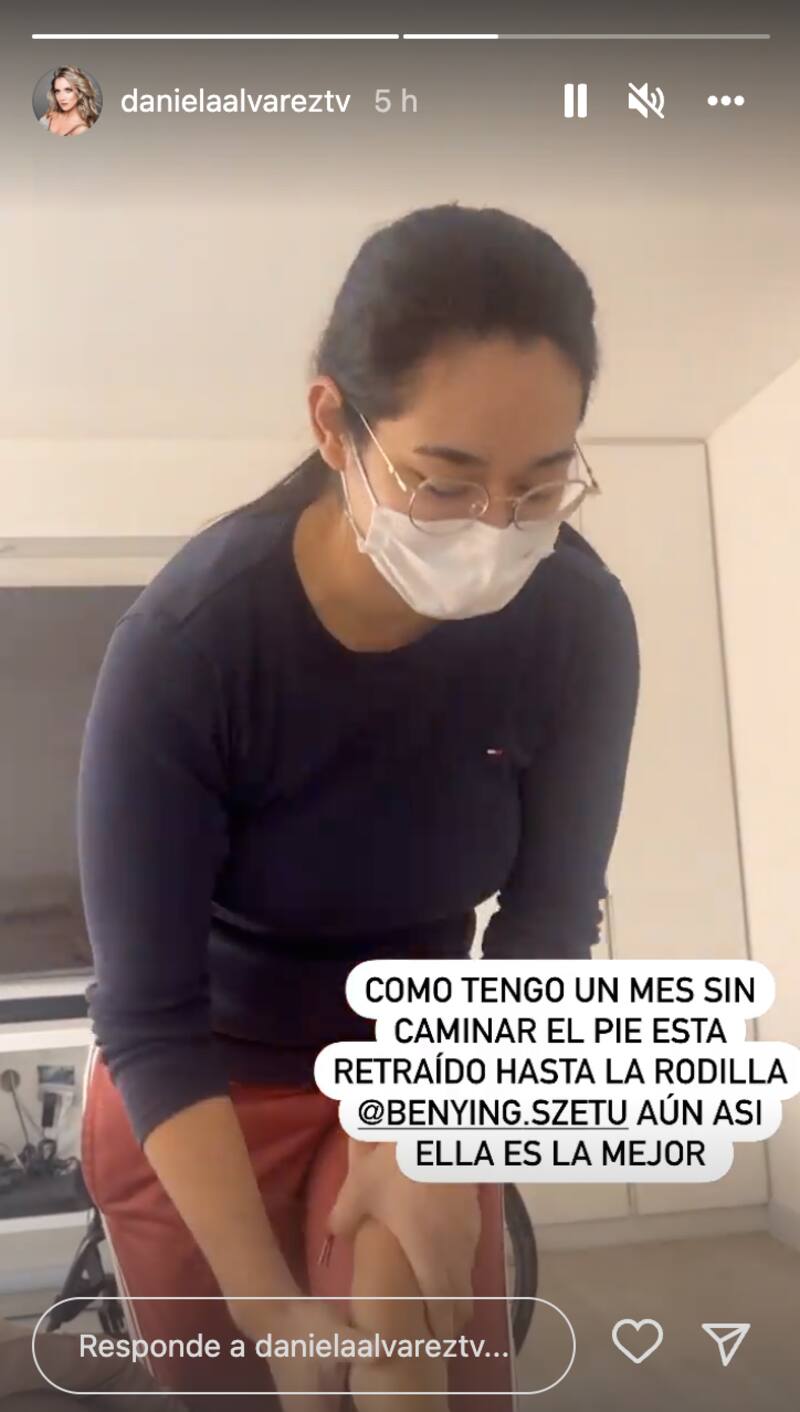 Este miércoles por medio de sus redes sociales Daniella Álvarez contó que por la falta de movilidad y no caminar por más de un mes, su pie está retraído hasta la rodilla, por lo que todos los días en la mañana le tienen que dar sesiones de fisioterapia para que no le genere más molestias.