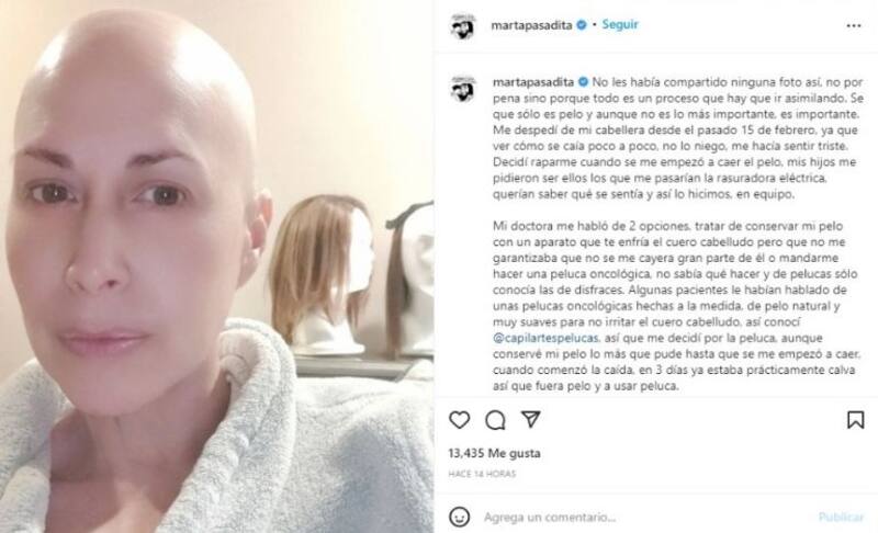 Marta recalcó que “no había compartido ninguna foto así, no por pena sino porque todo es un proceso que hay que ir asimilando”,  pues sabe que “solo es pelo y aunque no es lo más importante, es importante. Mi doctora me habló de 2 opciones, tratar de conservar mi pelo con un aparato que te enfría el cuero cabelludo pero que no me garantizaba que no se me cayera gran parte de él o mandarme hacer una peluca oncológica, no sabía qué hacer y de pelucas solo conocía las de disfraces”, mencionó.