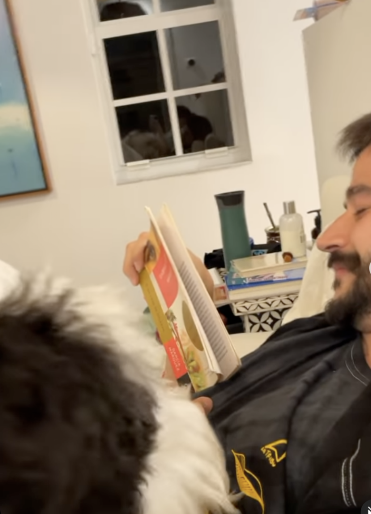 “Voltea para la foto, como que el tío te va acompañar a leer”, se escucha decir a la futura mamá entre risas mientras graba a Camilo acostado en la cama, con libro en mano y al lado de su perro, que no cedía ante el cariño del ganador del Grammy, e incluso el can no deja de morderle las manos cuando intenta agarrarlo.