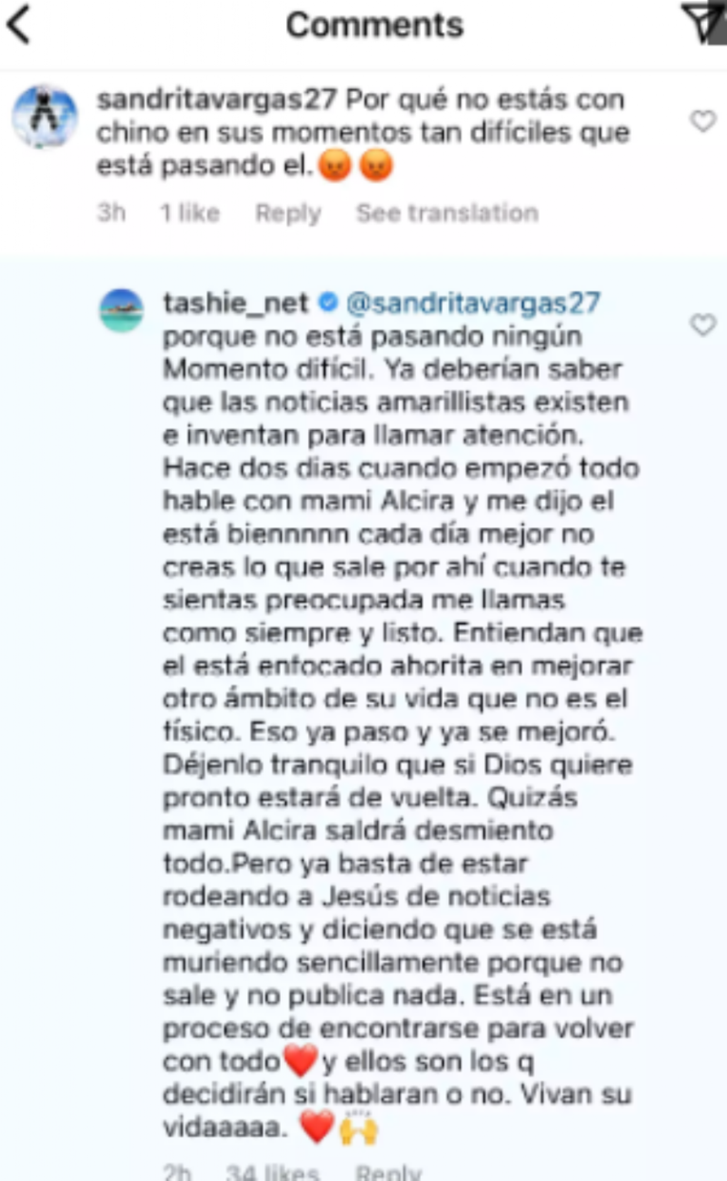 Finalmente, pidió a sus seguidores que vivieran su vida, no sin antes reiterar que Chyno ya superó sus problemas de salud y el que no aparezca de manera pública no significa que se esté muriendo, como se ha mencionado en los últimos días.