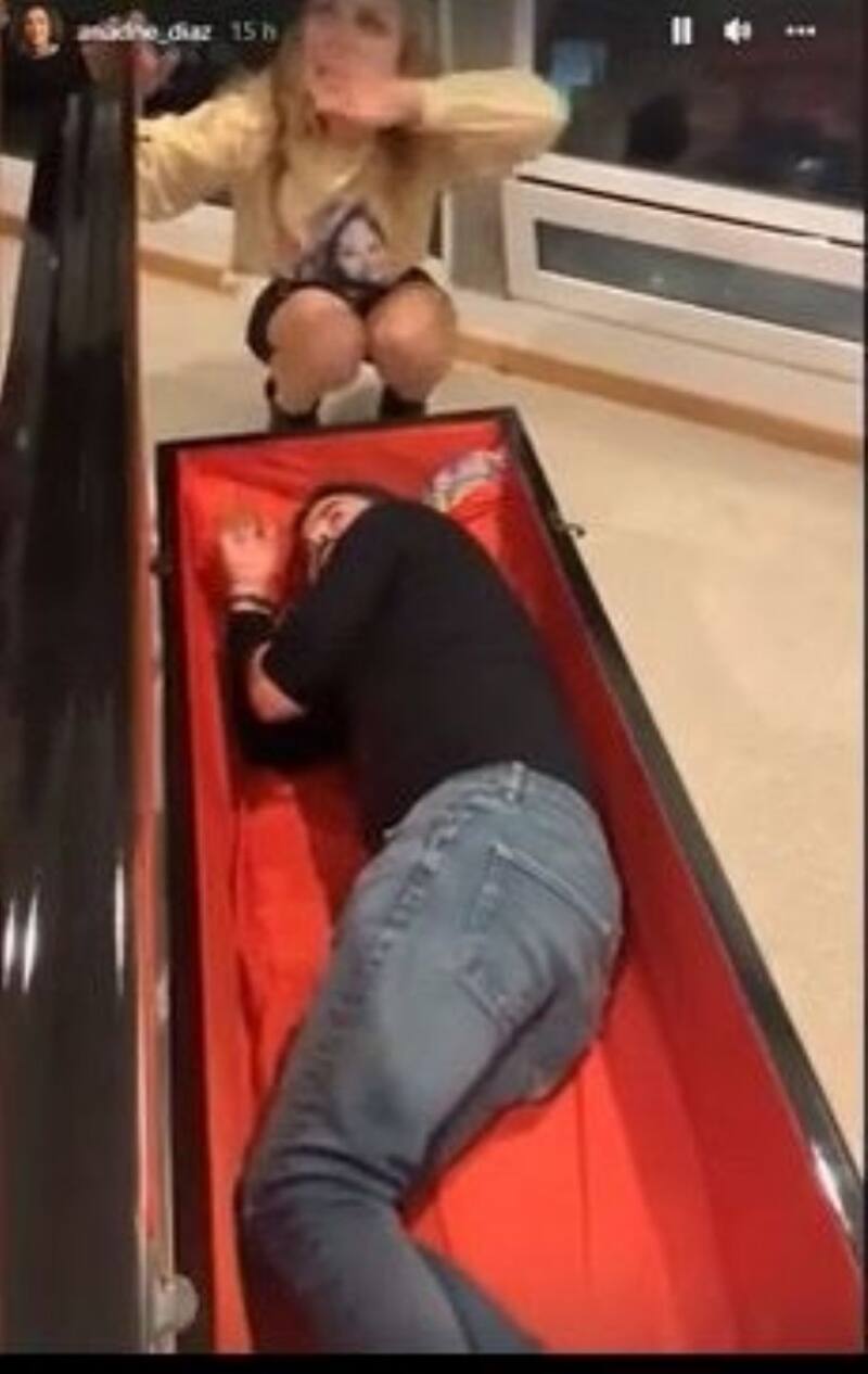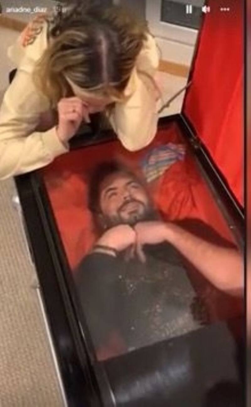 El conductor le enseñó a Ariadne cómo acomodarse para entrar y unas personas que se encuentran con él cierran la tapa. “No no, no puedo. José Eduardo salte de ahí”, expresó la protagonista de Llena de amor. “Ay no no. Ni siquiera se oye bien”, agregó. En el video que compartió, se puede ver que algunos amigos comienzan se meten al ataúd de la forma en la que les enseñó el actor.