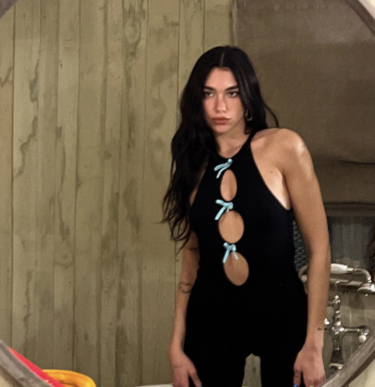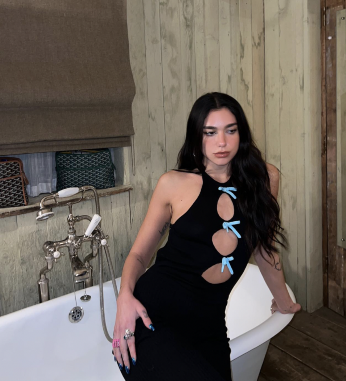 La intérprete de Break my Heart tituló su publicación como “Historias de la hora del baño”, en él posa junto a su amiga Sarah Lysander en un baño con tina, pero para decepción de muchos lo hace con un jumpsuit negro de corte capri que tiene unos detalles de tiernos moños en tono azul cielo, su look lo completó con uno estiletos de Cenicienta y su melena, que volvió al castaño, suelta.