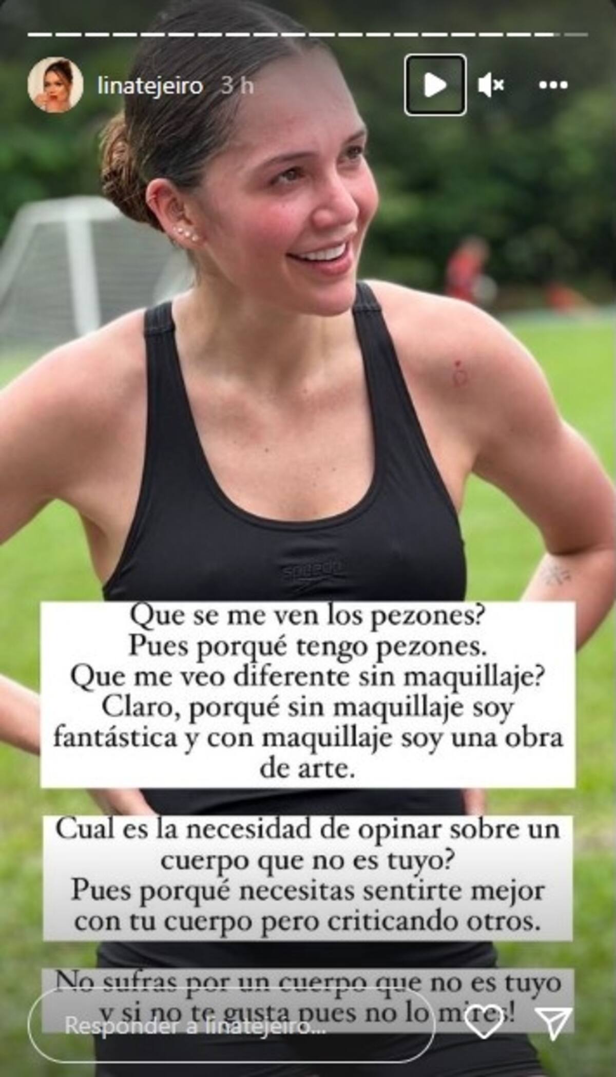 Pero Lina Tejeiro no quiso quedarse callada y les retrucó a sus críticos de una manera muy directa: "¿Cuál es la necesidad de opinar sobre un cuepro que no es tuyo? Pues, porque necesitas sentirte mejor con tu cuerpo, pero criticando otros. No sufras por un cuerpo que no es tuyo y si no te gusta, pues no lo mires!".