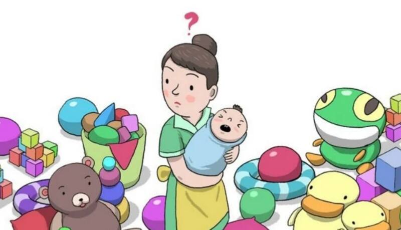 En la imagen notarás a la mamá posicionada en el centro de la habitación y rodeada de muchos juguetes. Ella está de pie con el pequeño en sus brazos, por lo cual le resulta más complicado el poder agacharse a buscar el chupón que soltó su hijo.