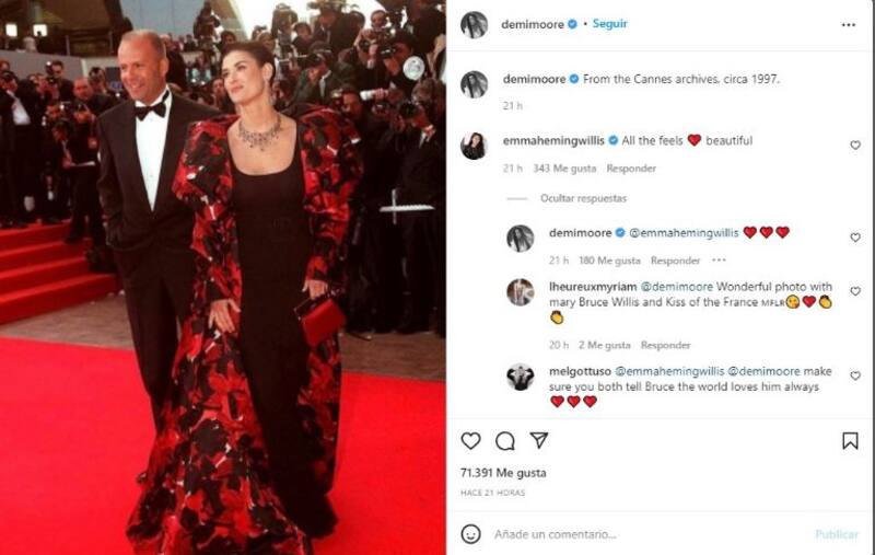 “Todos los sentimientos, es hermoso”, expresó la pareja del protagonista de El quinto elemento, a lo que Moore contestó con varios emojis de corazón rojo. Esta reacción de ambas mujeres también fue celebrada por los internautas, ya que dejan en claro que no debe haber enemistades y más ahora que Willis requiere el apoyo de todos sus familiares.