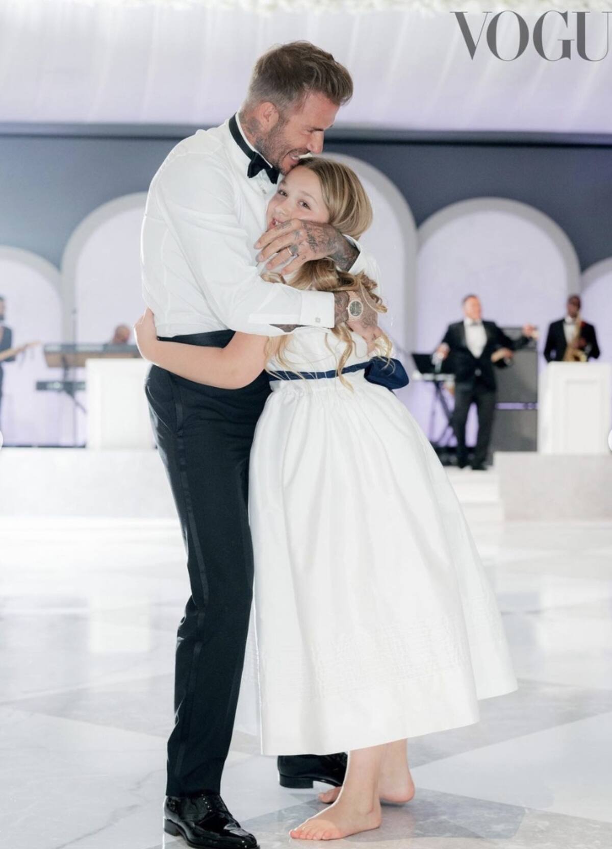 En la serie de fotografías se puede observar una en la que aparecen Victoria y David Beckham abrazados, una más donde el futbolista está con su hija más pequeña Harper. En otra también figuran Romeo y Cruz haciendo un brindis por los novios, mientras que en otra de las instantáneas lucen los recién casados junto a sus respectivos padres.