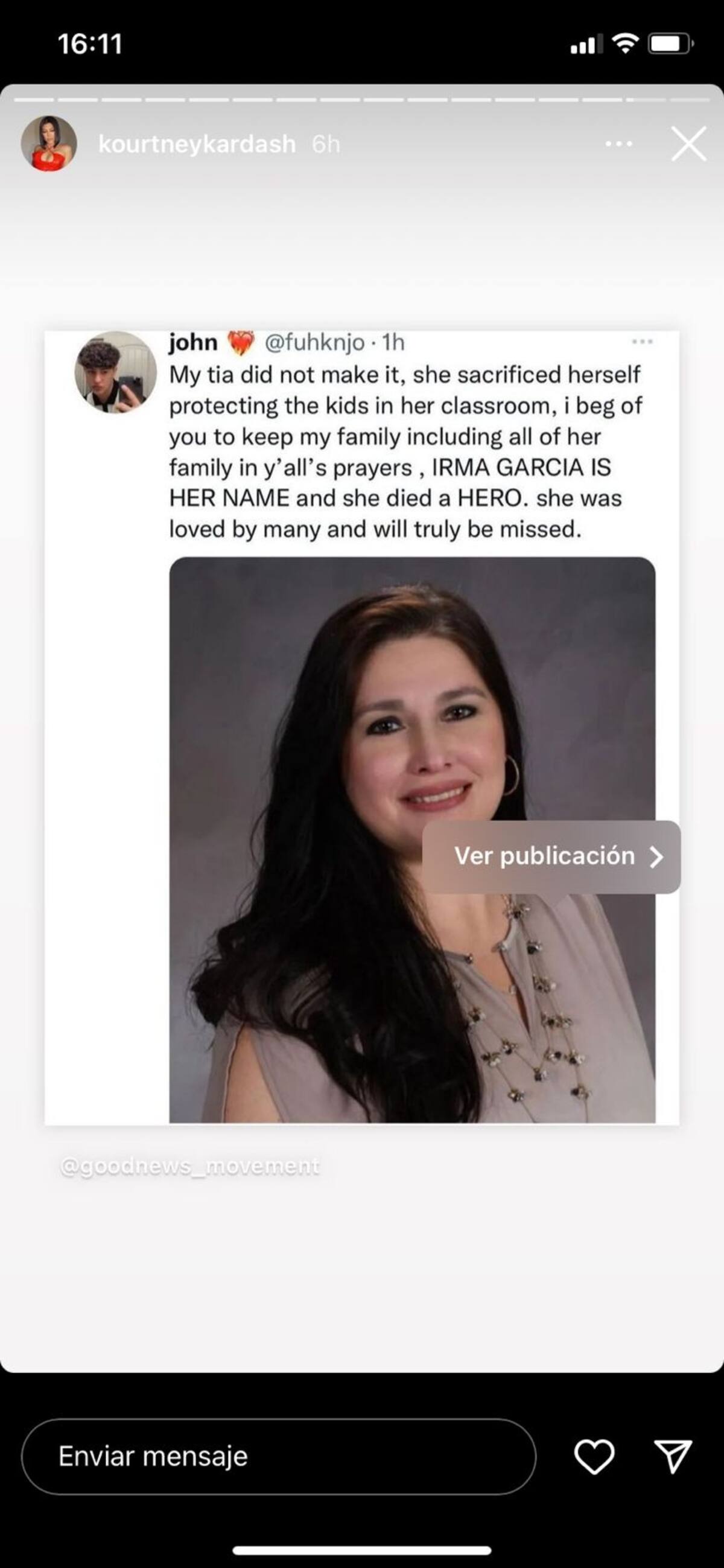 "Mi tía no lo logró, se sacrificó protegiendo a los niños en su salón de clases, les ruego que mantengan a mi familia, incluida toda su familia, en las oraciones de ustedes, IRMA GARCIA ES SU NOMBRE y murió como HÉROE. ella fue amada por muchos y realmente la extrañaremos", expresó uno de los sobrinos de la maestra abatida.