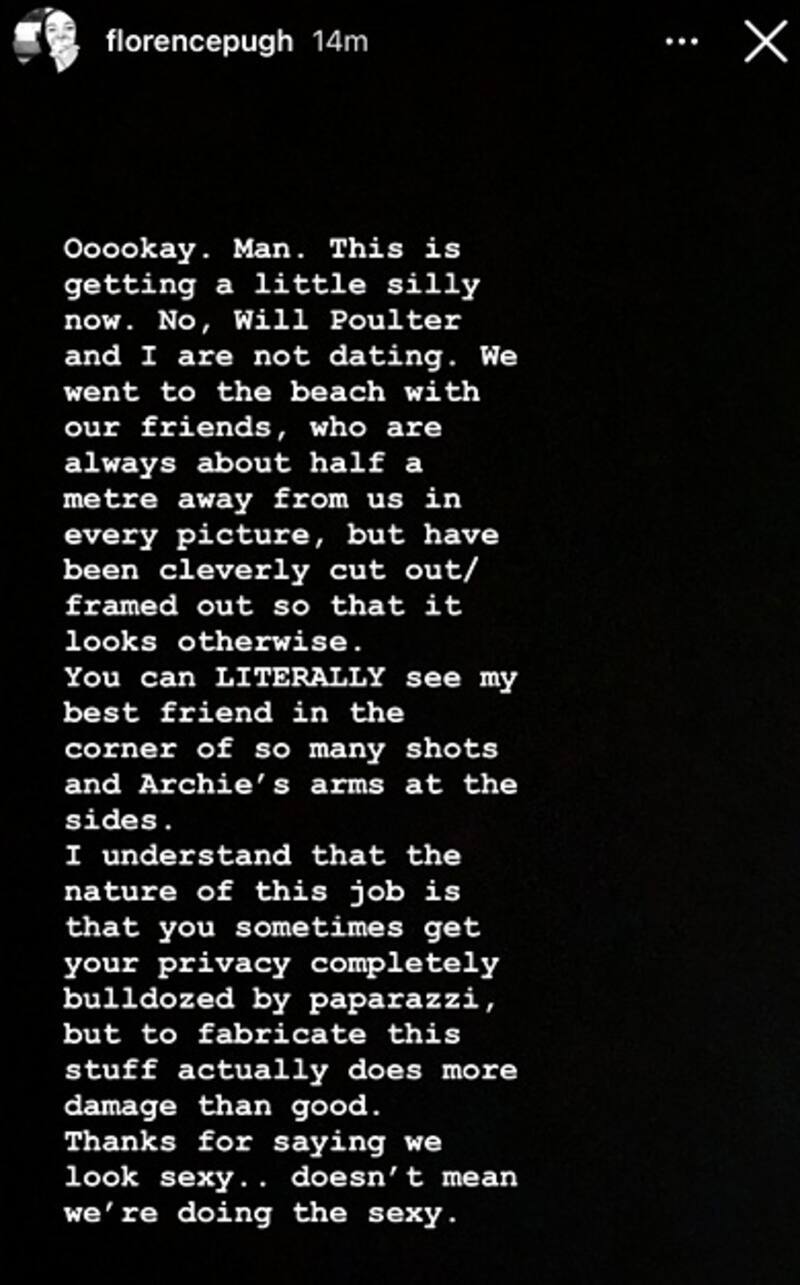 "Oook, esto se está volviendo un poco tonto. No, Will Poulter y yo no estamos saliendo. Fuimos a la playa con nuestros amigos, quienes estaban a medio metro de nosotros en cada foto", comenzó explicando la actriz en un escrito en sus stories.