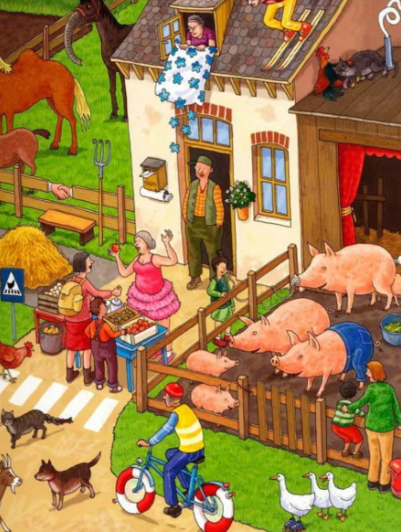¿Lo has conseguido?, como te dijimos hay muchos elementos, entre ellos una granja, un hombre en bicicleta, la mujer con su puesto de frutas, un niño que intenta estar más cerca de los animales... Si todavía no los hallas aquí va la pista: Están muy cerca de la granja.