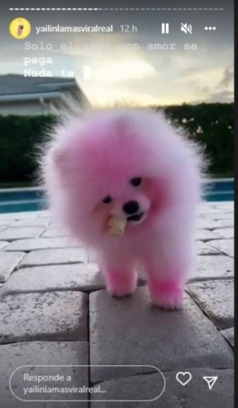A través de historias en Instagram, Yailin publicó una fotografía que le tomaron antes de subir a un avión, en esta usa un pantalón y blusa, ambos en color rosa, posteriormente subió dos fotos de su pomerania con el pelo completamente cambiado con el mismo color de su look. El pequeño voltea a la cámara y logran capturar a detalle el cambio que le realizaron.