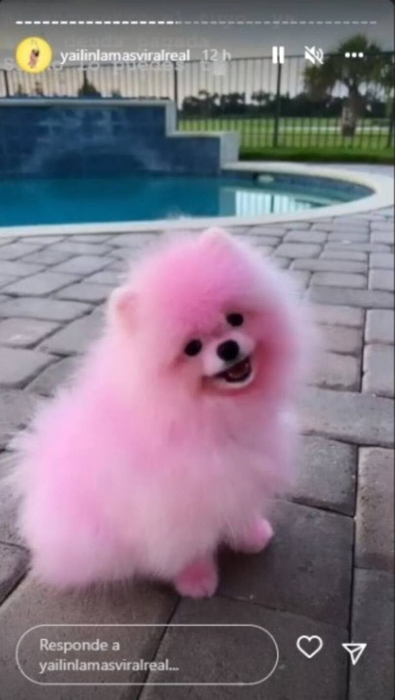 A través de historias en Instagram, Yailin publicó una fotografía que le tomaron antes de subir a un avión, en esta usa un pantalón y blusa, ambos en color rosa, posteriormente subió dos fotos de su pomerania con el pelo completamente cambiado con el mismo color de su look. El pequeño voltea a la cámara y logran capturar a detalle el cambio que le realizaron.
