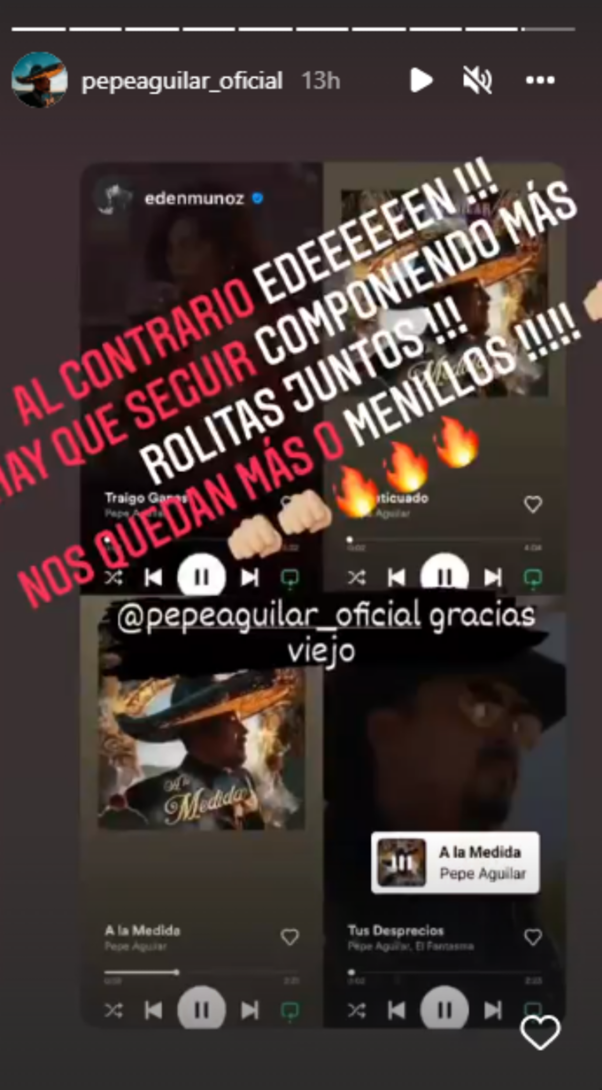 Los fans de Pepe Aguilar esperaban que él también hiciera un comentario alusivo a esa publicación o, al menos, la compartiera en sus redes, pero no fue así. Y de quien sí retomó una imagen fue de Edén Muñoz, quien agradeció por sus colaboraciones en conjunto.