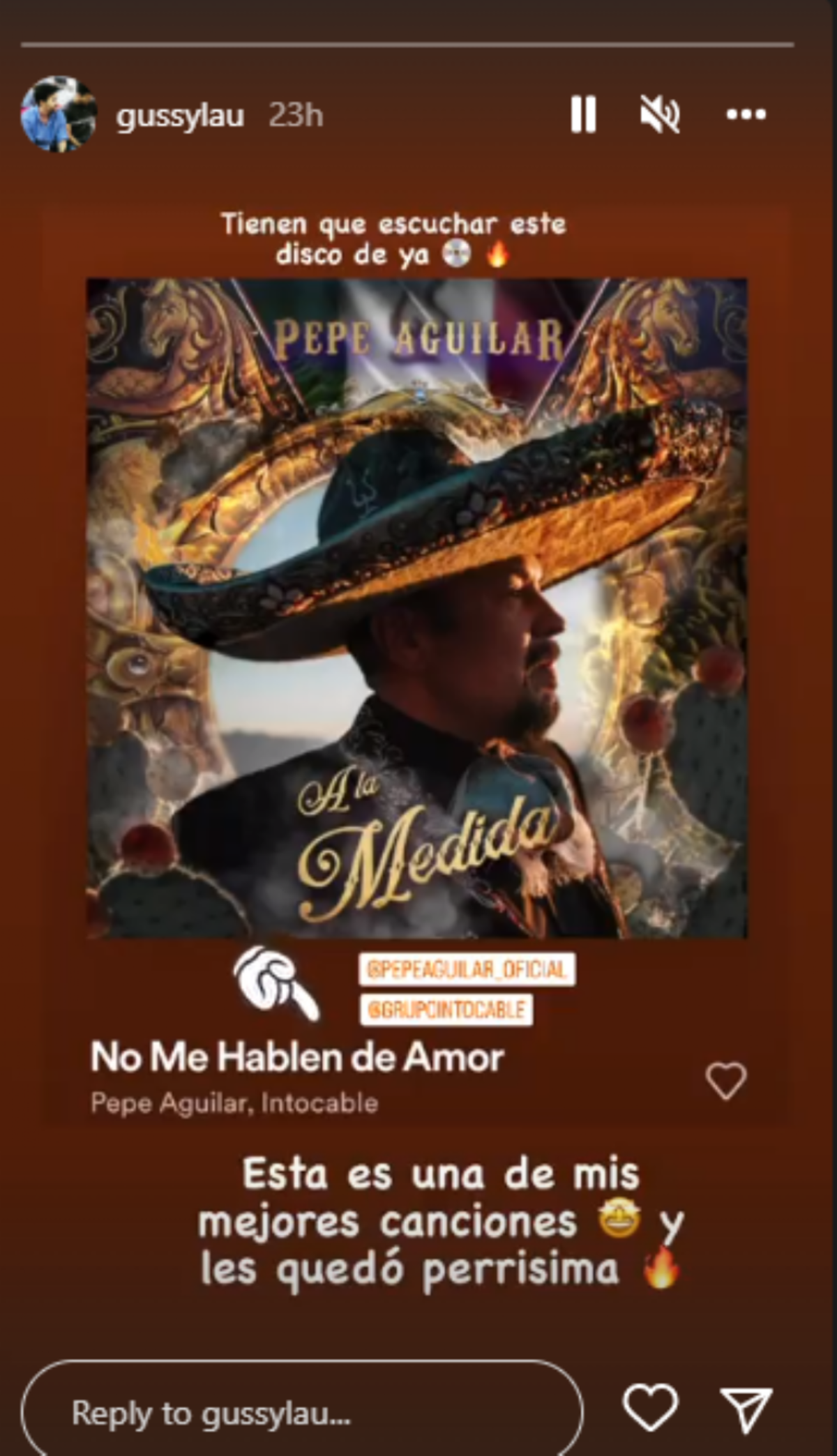 Pepe Aguilar tampoco ha hablado al respecto; sin embargo, en una reciente publicación en redes sociales, Gussy dio señales de que podría seguir en contacto con Pepe luego de un agradecimiento público que hizo en una historia de Instagram.