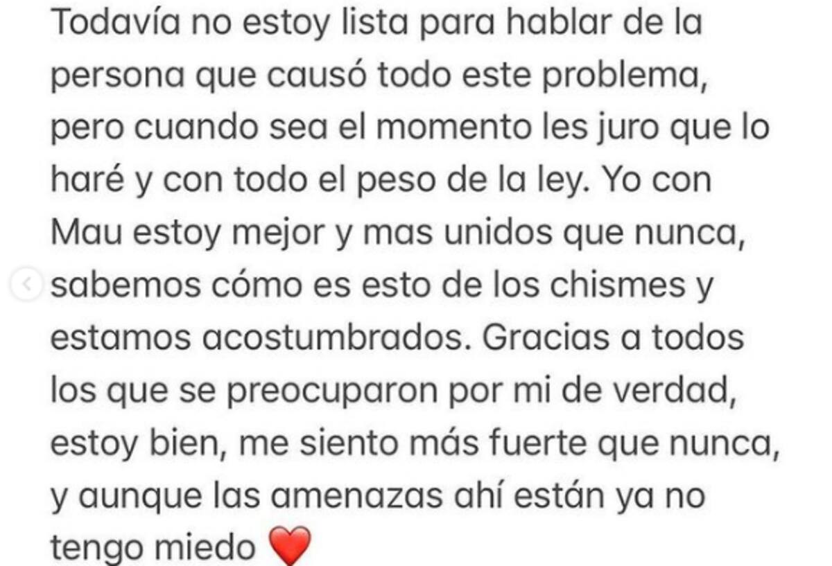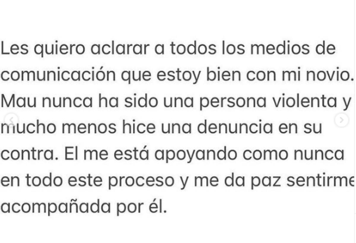"Les quiero aclarar a todos los medios de comunicación que estoy bien con mi novio. Mau nunca ha sido una persona violenta y mucho menos hice una denuncia en su contra. Él me está apoyando como nunca en todo este proceso y me da paz sentirme acompañada por él. Yo con Mau estoy mejor que nunca", explicó.