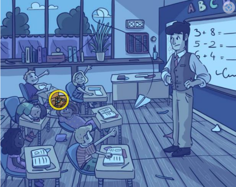 A continuación encontrarás la imagen donde verás a un grupo de niños un poco rebeldes que, además de ocultar las gafas de su compañero y prestar poca atención a su clase, se la pasan lanzando aviones de papel a su profesor.