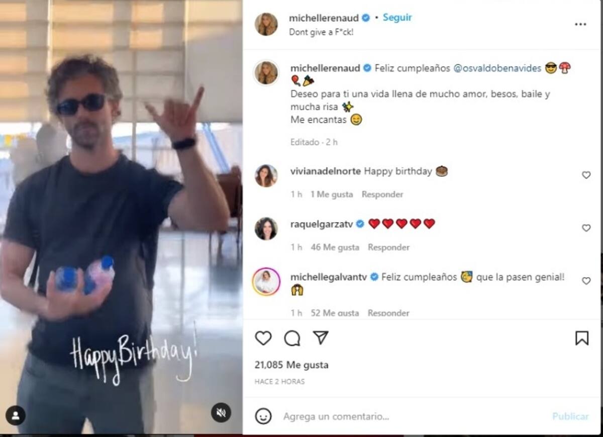 "Feliz cumpleaños @osvaldobenavides. Deseo para ti una vida llena de mucho amor, besos, baile y mucha risa. Me encantas", escribió la actriz en su cuenta de Instagram en la que subió esta grabación en la que aparece su novio, en la imagen simplemente se ve cómo le hace zoom en repetidas ocasiones mientras Benavides sonríe y hace movimientos con las manos.