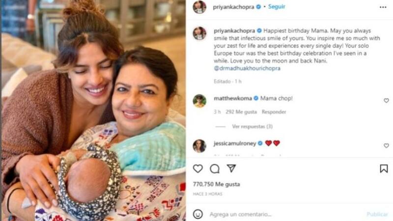 Hace unos días, el matrimonio publicó en Instagram una foto de su familia: Priyanka cargando a su bebé y Nick apreciando a ambas. La publicación causó revuelo entre sus seguidores pues era totalmente desconocida la cara del bebé, que aunque taparon con un corazón, permitieron que se viera su cuerpecito.