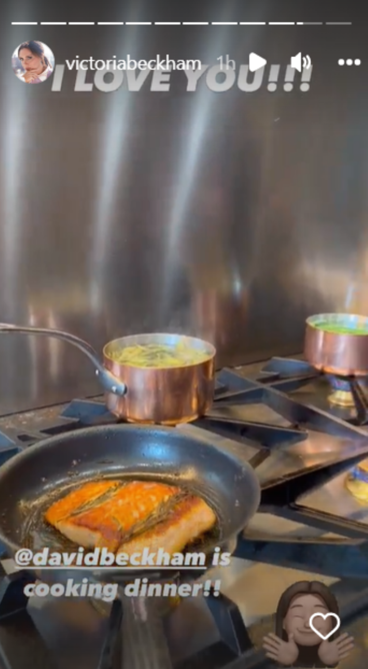 En otro clip la también empresaria no dudo en reiterar su amor por quien fuera capitán del equipo inglés, además de mostrar el resultado final del salmón a la plancha que cocinó Beckham y que acompañó con una saludable ensalada.