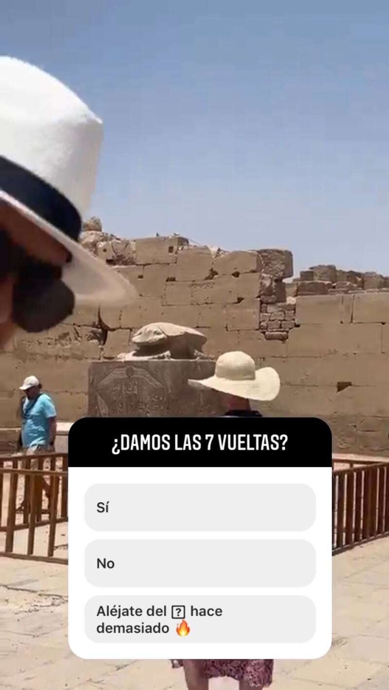 La pareja estuvo visitando los templos egipcios y en su recorrido llegaron a la estatua del escarabajo, un insecto sumamente importante para esta civilización, que se encuentra en Karnak, sitio en el que ya es una tradición darle siete vueltas a esta estatua para atraer la buena suerte. "¿Lo hacemos (dar las vueltas)?. Sí o no, ¿qué dicen?", comentó Cynthia.