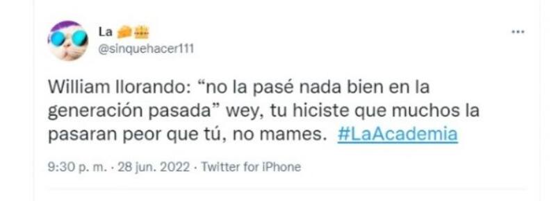 “Pues tiene mucha razón Santiago. William Valdés es bien mam**", Ya bájenlo de su nube, cae mal”, “Que despidan a William Valdés. Ya chole de soportar a alguien tan ineficiente, tan soberbio y prepotente. Fuera ! !”, “Ya ni los alumnos de #LaAcademia aguantan a @WilliamValdes”, “Por primera vez en la vida, apoyo a Santiago, William es insoportable y siempre llora cuando “le hacen” algo, pero él es bien intrigoso #LaAcademia”, mencionaron cibernautas en Twitter.