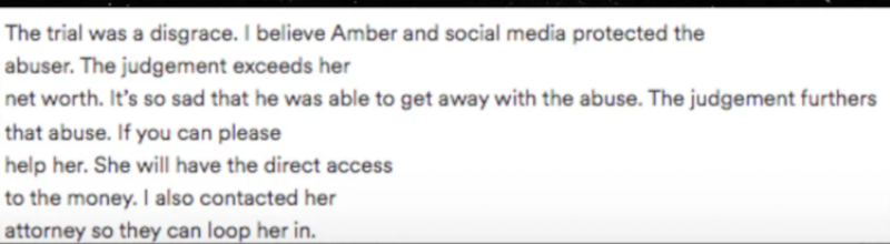 Según la mujer ya se había puesto en contacto con los abogados de la actriz y prometió que Amber tendría acceso a los fondos en todo momento: "Creo que Amber y las redes sociales protegieron al abusador. El juicio excede su patrimonio neto. Es muy triste que él haya podido salirse con la suya con el abuso. El juicio fomenta ese abuso. Si puede, ayúdela", refiere la descripción.