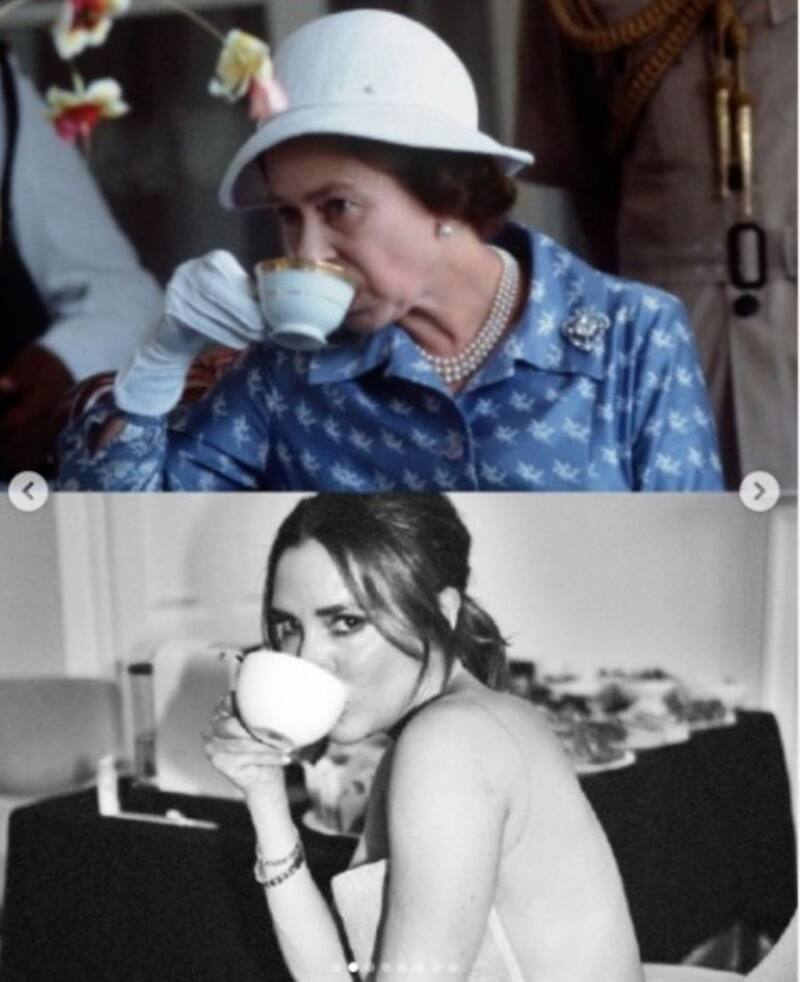Como parte de estas comparaciones, la empresaria tomó ocho fotos de Su Majestad que tuvieran la misma temática de algunos de sus retratos: con sus amados corgis, tomando una taza de té, saludando por la ventana, portando un look de lentes oscuros y pashmina, frente a una computadora y levantando una copa de vino.