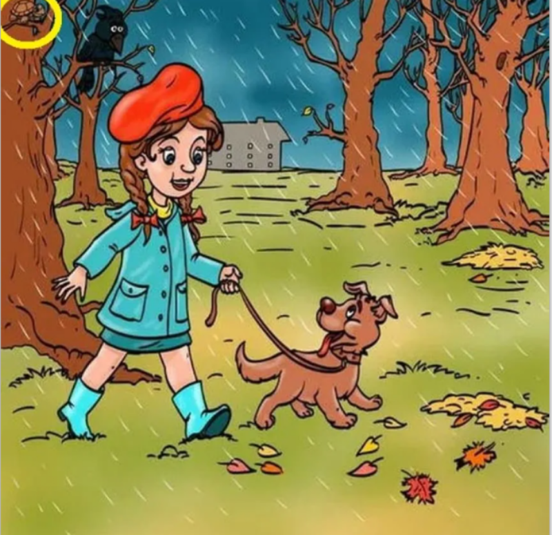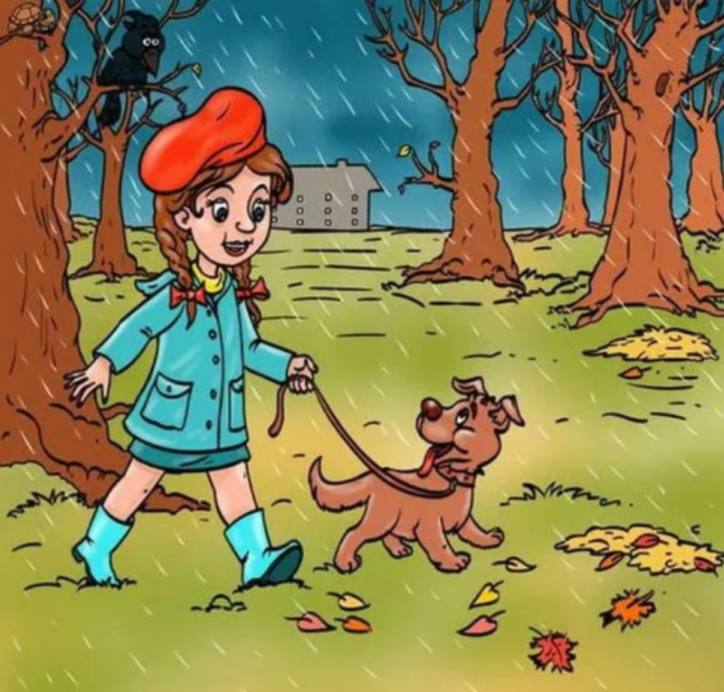 En la imagen de abajo verás a una niña que pasea muy feliz con su perro en un día muy lluvioso. Aunque ellos se ven muy alegres, hay otros animalitos que están asustados y han buscado dónde esconderse, mientras termina la mala temporada.