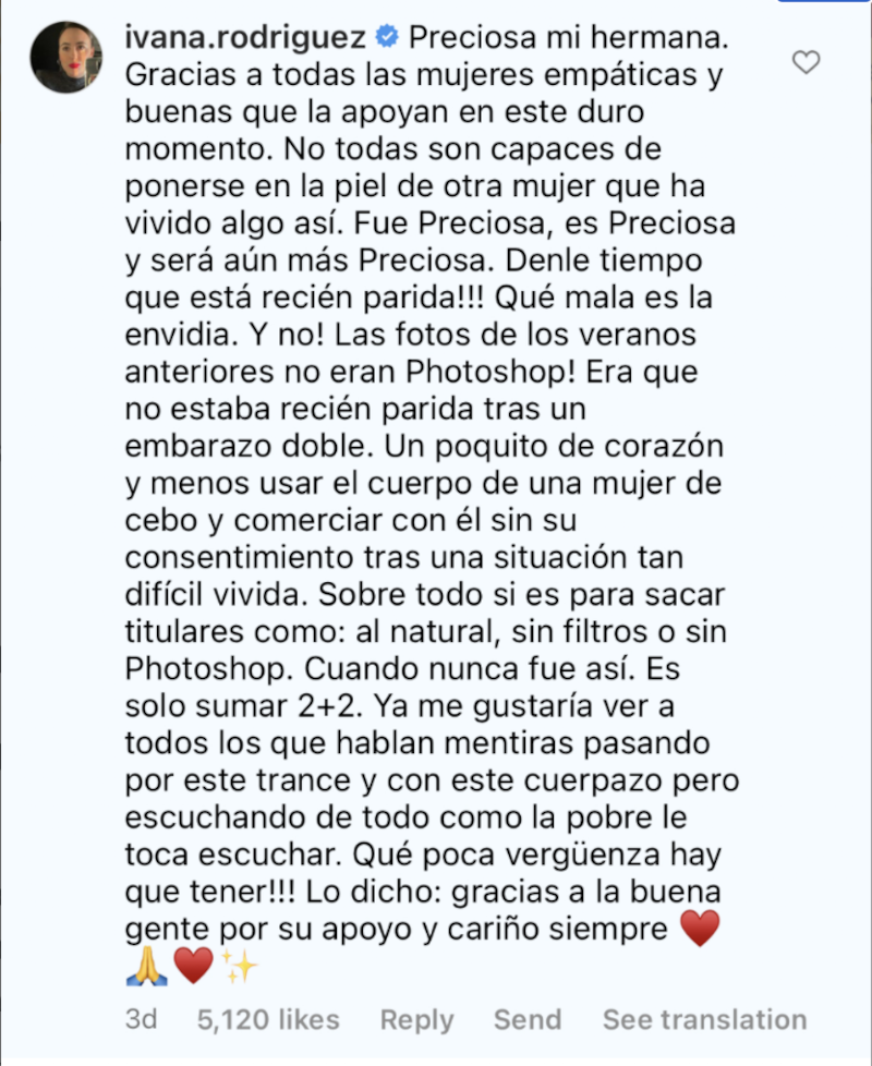 "¡Denle tiempo que está recién parida! Qué mala es la envidia. ¡Y no, las fotos de los veranos anteriores no eran Photoshop! Era que no estaba recién parida tras un embarazo doble. Un poquito más de corazón y menos usar el cuerpo de una mujer de cebo y comercializar con él sin su consentimiento tras una situación tan difícil de vida”, continuó la hermana.