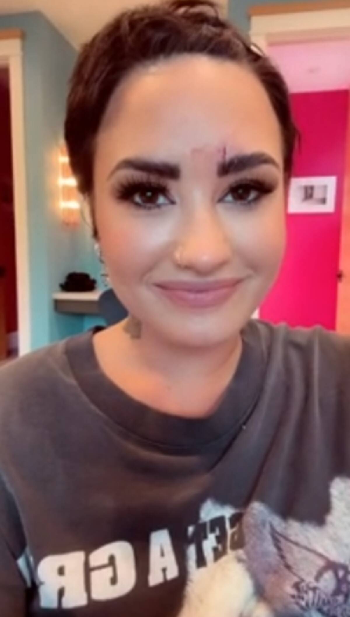 A través de su cuenta oficial de Tik Tok, la intérprete de Sorry Not Sorry informó a sus más de 3.7 millones de seguidores que había sufrido un accidente con un cristal, el cual le provocó una herida profunda en la parte de su frente y cerca de la ceja.