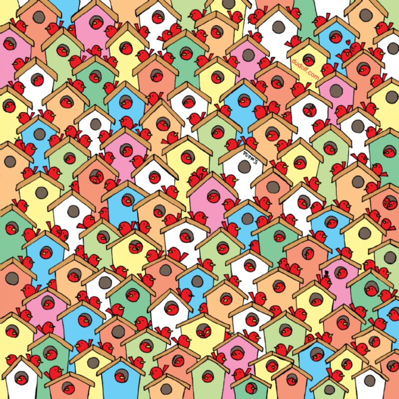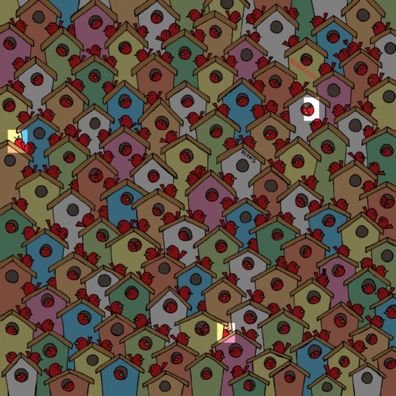El de esta edición parece muy fácil de resolver pero no lo es tanto, en esta imagen podemos ver a muchos pájaros que bien podrían ser cardenales y están pasando un rato agradable en sus casitas de madera, hay algunos que están dentro de ellas y otros más solo posando, pero entre ellos se esconden tres manzanas, el reto es encontrarlos en menos de un minuto.