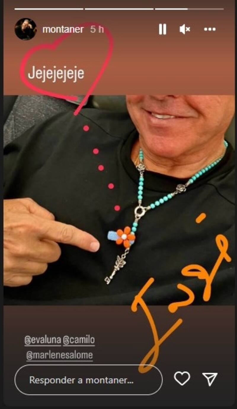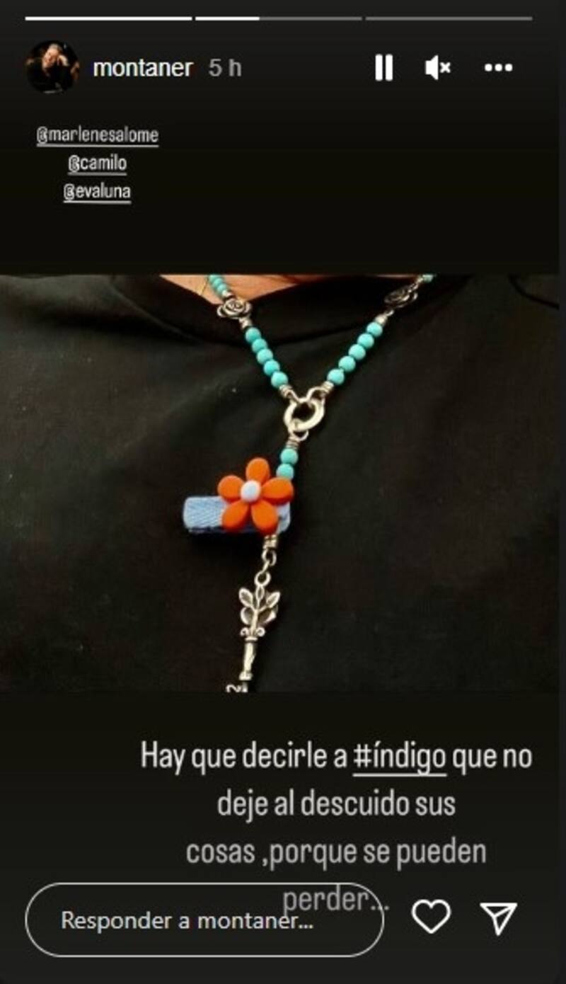 "Hay que decirle a #Índigo que no deje al descuido sus cosas porque se le pueden perder…", refirió en sus stories de Instagram para acompañar una imagen del pecho del cantante y del que cuelga un collar con el prendedor, en otra de las imágenes se ve completo el diseño que igual acompañó con unas letras que denotan risa y la palabra "Indi".