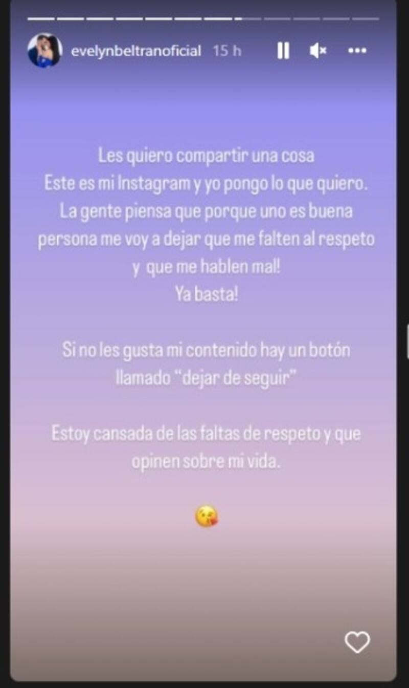 "La gente piensa que porque uno es buena persona voy a dejar que me falte al respeto y que me hablen mal. Ya basta", comentó Eveleyn quien pidió que ya no la siguiera. "Si no les gusta mi contenido hay un botón llamado: dejar de seguir. Estoy cansada de las faltas de respeto y que opinen sobre mi vida", sentenció agregando un emoji de beso.