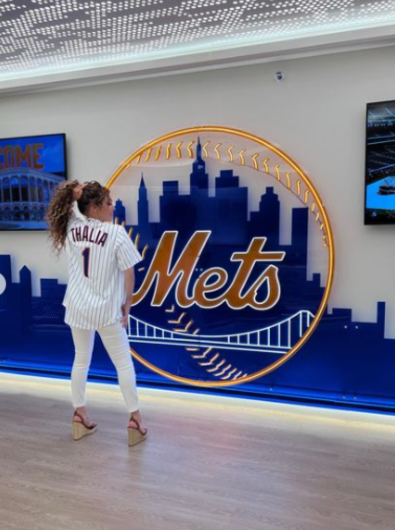 A través de las historias de Instagram Thalía compartió primero una foto en la que posa con una pelota de beisbol y su playera de los Mets, pero esa fue sola la introducción a lo que venía después, ya que en un segundo posteo subió un video en el que presumió haber llegado hasta los vestidores del equipo aunque los jugadores no se esperaban lo que iba a suceder después.